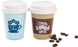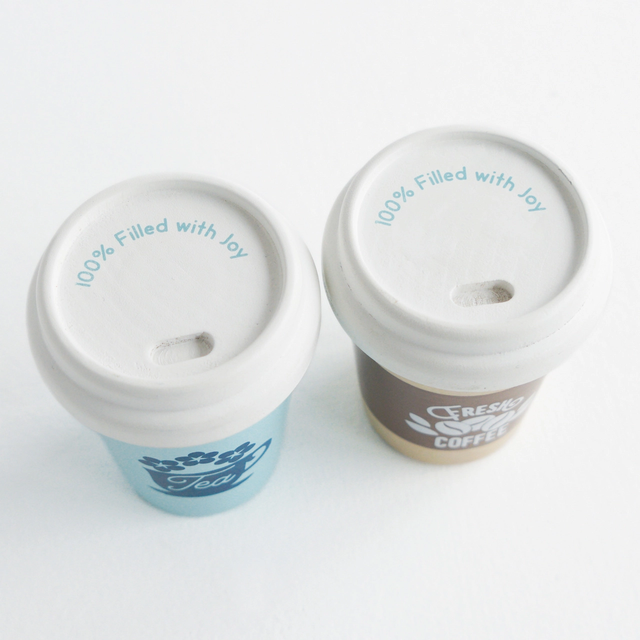 Две детайлно изработени чашки „Fresh Coffee“ и „Tea“ с бели капачета придават на игрите на кафене и чаен кът истински чар.