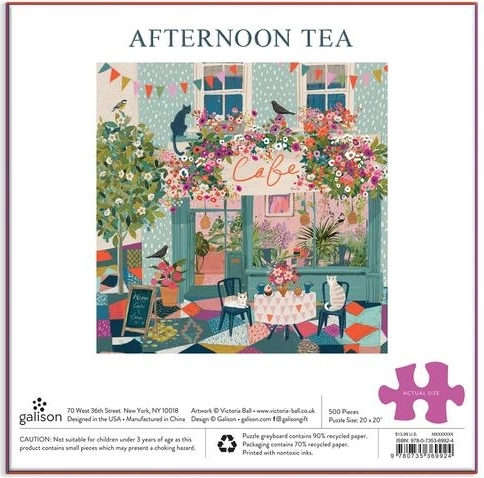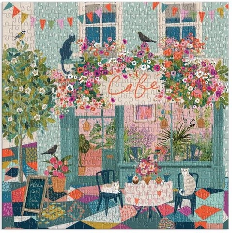 Насладете се на релакс с подреждане на красив мотив от художничката Виктория Бол – улично кафене, изпълнено с цветя, котки и птици. Това висококачествено пъзело от 500 части предлага премиум изработка, прецизно напасване на частите и е отпечатано с нетоксични мастила върху рециклирана хартия.