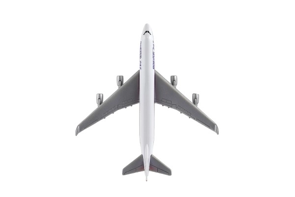 Този детайлно изработен модел на Boeing 747 (Jumbo Jet) комбинира издръжлив метал с висококачествени пластмасови части, което го прави отличен за ежедневна игра и като стилно допълнение към колекция от авиационни модели. Реалистичните пропорции, видимите двигатели и крила ще зарадват малки пилоти и запалени колекционери.