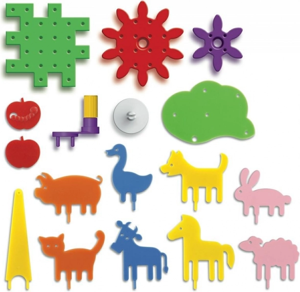Quercetti Georello Ферма е идеалната играчка за всяко дете, което обича да твори и строи. Този предавков конструктор включва перфорирани плочи, оси, зъбни колела и фигурки на животни, които лесно се сглобяват в впечатляваща фермерска сцена. С помощта на ръчката можете да задвижите механизма и да видите как всичко се върти като на въртележка.