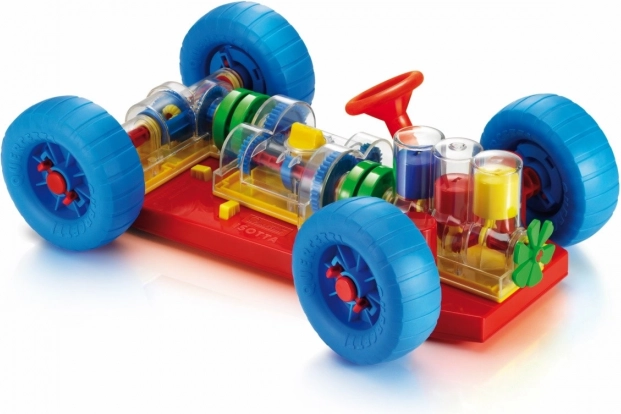 Изобретателна играчка, която приканва децата и техните родители да открият как работи едно истинско автомобилче. Всички основни механични функции са точно възпроизведени. При двигателя децата ще видят как работят цилиндрите и коляновият вал и как са свързани със скоростната кутия, която има работещо превключване с 3 положения (неутрална, 1-ва и 2-ра предавка). Диференциалът предава движението към задните колела и позволява те да се въртят независимо едно от друго. Всички механични части могат лесно да се прикрепят към шасито и също толкова лесно да се освобождават със специалните пружинирани жълти бутони. Воланът е функционален и позволява колата да завива или да влиза в паркинг. Децата могат също да повдигат колата отпред и отзад с помощта на специални колички, като завъртането на манивелата на предната от тях задвижва целия механизъм. При превключване на отделните скорости ще видят как се променя скоростта на движение на колелата и цилиндрите. При включване на неутрална ще забележат как двигателят и диференциалът се разединяват. Предназначено за деца от 3 години.
