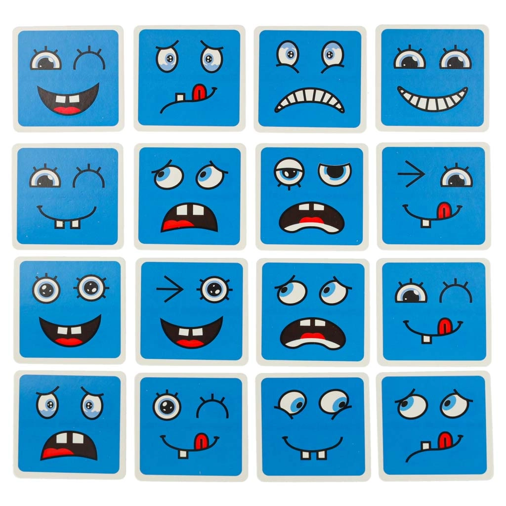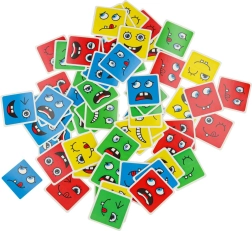 Забавна логическа игра за деца и възрастни, която развива разпознаването на емоциите, логическото мислене и фината моторика. Завъртете цветните дървени кубчета и по зададеното на картите подредете правилния израз на лицето – печели този, който направи най-много комбинации за най-кратко време. Безопасна дървена изработка, 64 карти с изражения и 16 кубчета в четири цвята за безкрайна доза забавление и учене.