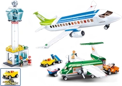 Сглобете пълноценно летище с голям пътнически самолет, по-малка машина, контролна кула и обслужващи превозни средства. Идеално за игра на авиационен трафик.