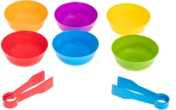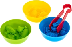 Този цветен комплект превръща първите стъпки в математиката в радост. Децата сортират превозните средства по цветове в купичките, броят, сравняват количества и изпълняват прости задачи. Включени са и пинсети, които естествено развиват захвата и координацията око–ръка.