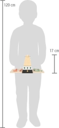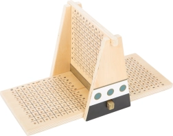 Търсете корабите на противника и защитавайте своята флотилия в модерното дървено издание на играта Кораби. Централната преграда осигурява дискретно подреждане и ясно отбелязване на попаденията и пропуските – сини флагчета за околни полета, бели за директни попадения. Благодарение на магнитите в рамката цялата конструкция е здрава и стабилна, така че всичко остава на мястото си дори по време на напрегнати дуели.