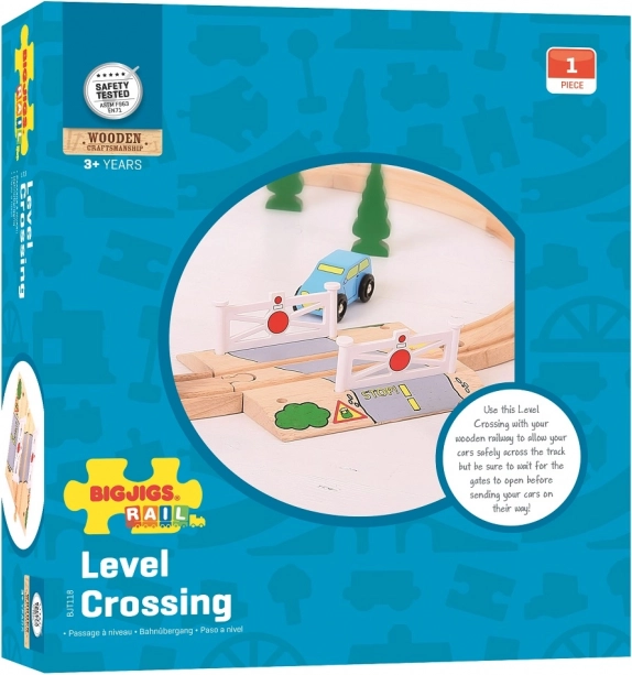 Произведен от висококачествени и отговорно добити естествени материали, този комплект подпомага въображението, сръчността и координацията при децата. Железопътният прелез има сгъваеми бариери, които перфектно пасват на влаковите линии на марката Bigjigs Rail, но може да се комбинира и с всички останали дървени влакови системи на пазара.