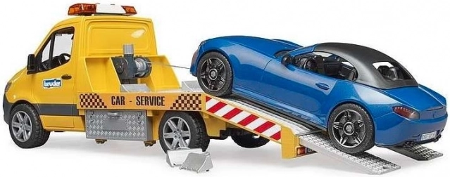 Камионът за пътна помощ BRUDER по модела на MB Sprinter впечатлява с детайлна изработка и богата функционалност. Децата ще харесат маяка със светлина и звук, реалистичната рампа с изтеглящи се релси и подпорни клинове, както и отваряемите врати и странични шкафчета. Част от комплекта е спортен кабриолет със сваляем покрив и сменяеми колела.