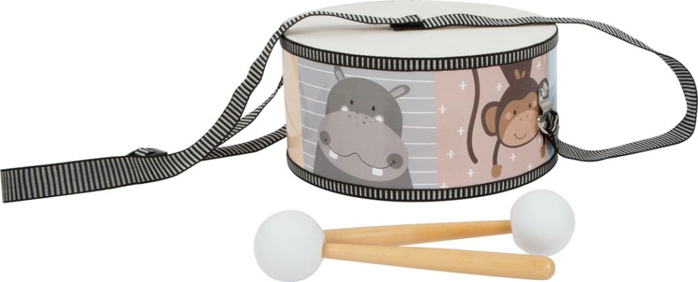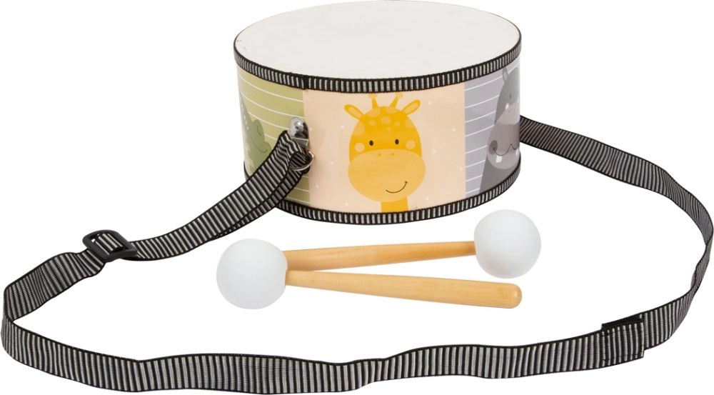 Детският барабан Цветно сафари от Small Foot е чудесен избор за развитие на ритъм, слухово възприятие и моторика. Благодарение на веселите илюстрации на животни децата бързо ще го заобичат и могат смело да тръгнат на поход – леко тяло, регулируема презрамка и практично закопчаване с велкро гарантират удобно използване.