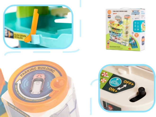 Открийте многофункционалния паркинг гараж, който превръща детската стая в оживен град. Четирите просторни етажа предлагат много място за паркиране, асансьорът издига количките до самия връх, а на покрива има и хелиодрум за любимия хеликоптер. Електрическият режим на асансьора е допълнен от весели светлини и мелодии, а при необходимост асансьорът може да се управлява ръчно.