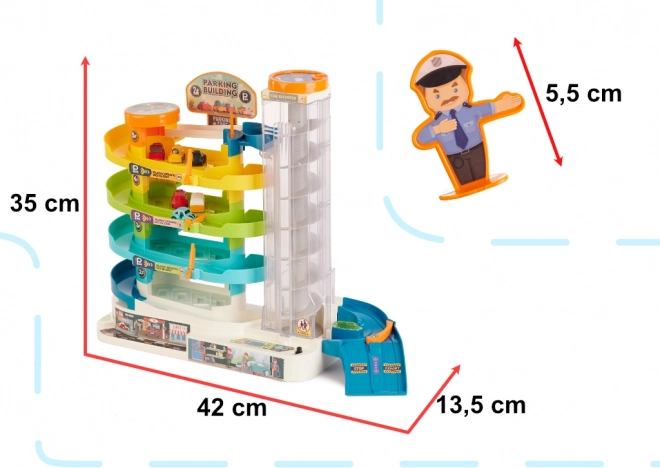 Многоетажен гараж, асансьор, пътища, изходи, декорации и стикери – всичко в атрактивна кутия, чудесно като подарък за деца от 3 години.