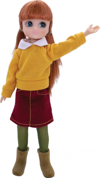 Кукла в есенно облекло – жълт пуловер, червена пола, зелени чорапогащи и кафяви обувки. Идеален за есенни разходки.