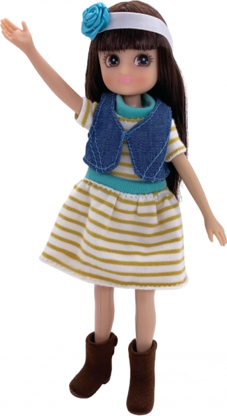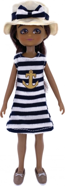 Кукла с рокля на морска тематика и съчетаващи се аксесоари, готова за летни приключения.