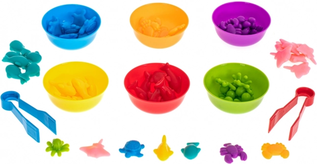 Този образователен комплект с морски животни превръща първите стъпки в математиката в забавление. Децата могат да сортират фигурките по купички според цветовете, да ги броят, да сравняват количества и да създават прости задачи. Пинсетите допълнително тренират захвата и координацията око–ръка.