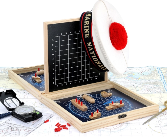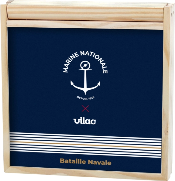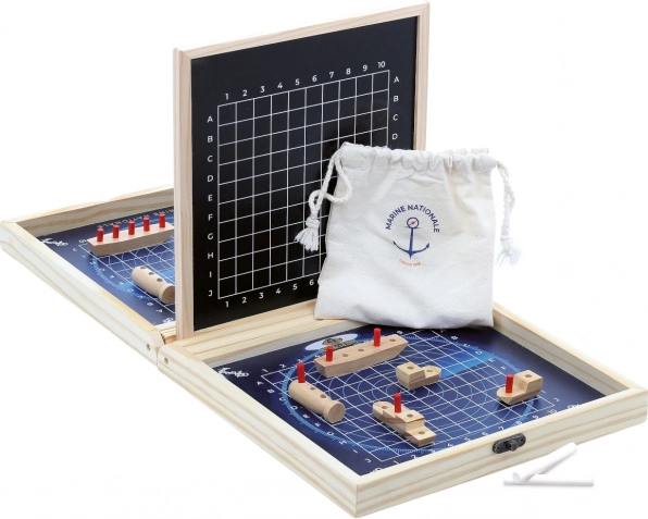 Открийте красотата и стратегията с тази прецизно изработена игра от Vilac, която носи морската битка директно у дома. Практичният дървен куфар служи не само за съхранение на частите, но и като игрално поле. Благодарение на повърхностите за писане с тебешир можете лесно да следите как напредва вашата битка. Здравите дървени части гарантират дълъг живот, а атрактивният дизайн ще очарова както деца, така и възрастни.
