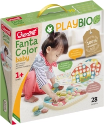 Мозайката Quercetti FantaColor Baby е част от серията PlayBio, което означава, че е изработена от 100% рециклирани материали, които са екологични и щадящи природата. Съдържа 28 части, включително перфорирана дъска и 21 цветни колчета, които лесно се поставят на мястото си. Играта с тази мозайка подпомага: