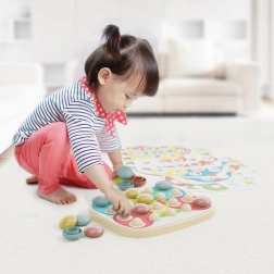 Всеки елемент от мозайката помага за развитие на координацията око-ръка и фините двигателни умения благодарение на цветните колчета.