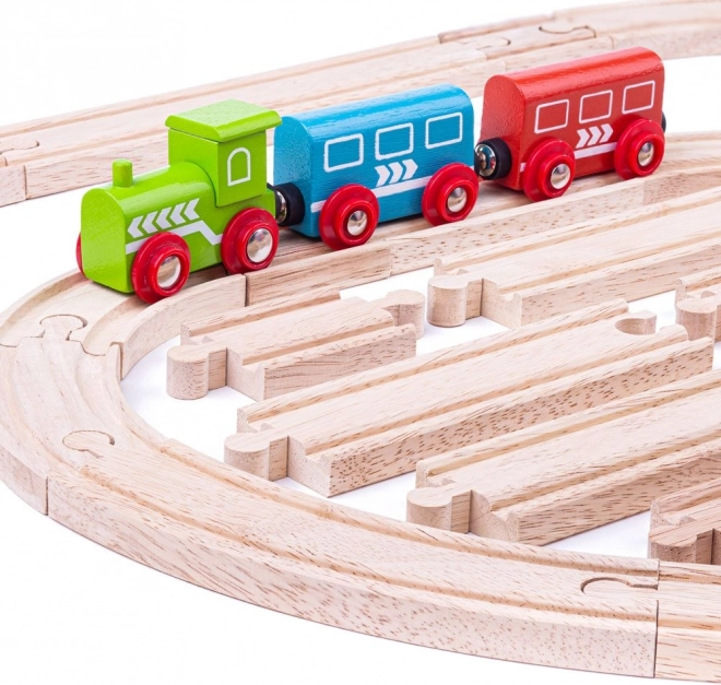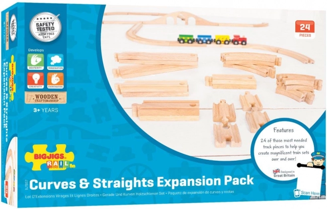 Комплектът дървени релси Bigjigs Rail дава на децата възможност за безкрайни игри и развитие на креативността. С 24 части те могат лесно да създават различни конфигурации на трасета и интерактивни истории. Благодарение на качествените естествени материали и съвместимостта с други марки този комплект е идеален като допълнение или разширение на съществуваща влакова писта.