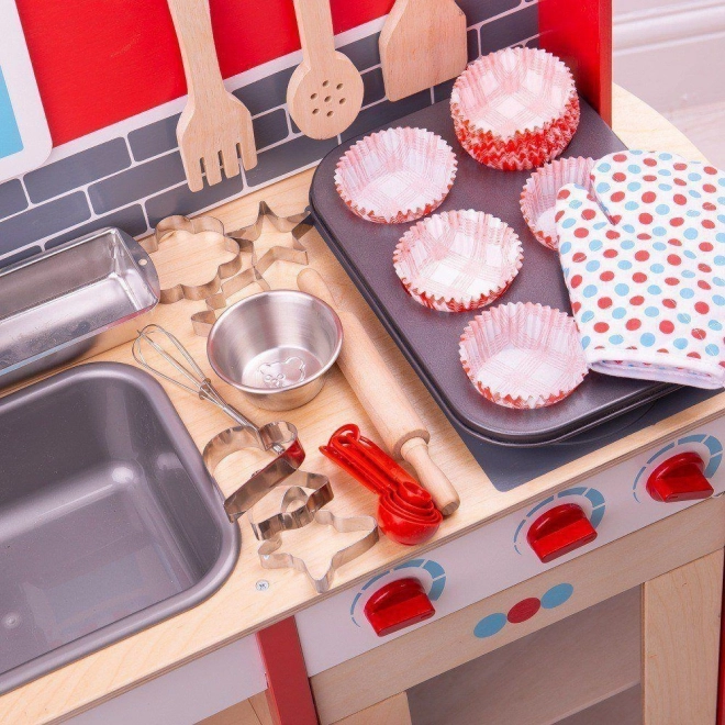 Този цялостен комплект за печене съдържа всичко необходимо, от което се нуждае всеки малък пекар за своите първи рецепти. Включва тава за печене, ръкавица за фурна, форма за хляб, бъркалка, дървено точило, купа, комплект мерителни лъжици и шест формички за сладки.