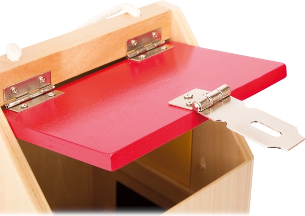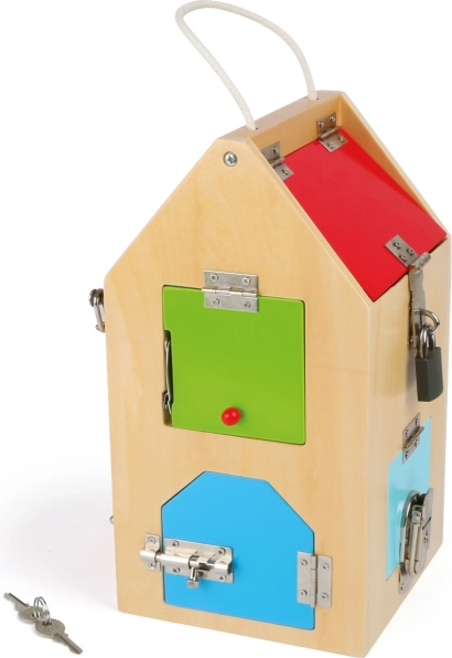 Къщичката е изработена от качествено дърво в комбинация със здрави метални части, така че издържа и на интензивна употреба. Благодарение на компактните размери и практичната дръжка е лесно преносима – идеална за пътувания, детска градина и детската стая. Цветните елементи приканват към откривателство и подпомагат разпознаването на цветовете.