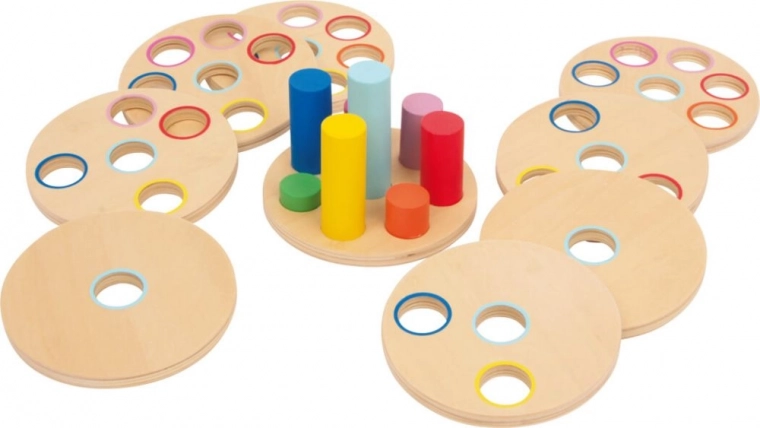 Тази дървена играчка е проектирана да помогне на децата да развиват ключови умения. Състои се от 9 части, включително 8 диска и стойка, които децата могат да комбинират. Всеки диск има различни цветни отвори, така че децата да тренират логическо мислене и фина моторика.