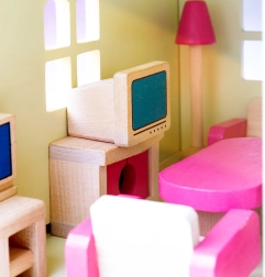 Този комплект дървени мебели за къщи за кукли е идеалното решение за всеки малък интериорен дизайнер. Комплектът включва всичко необходимо за обзавеждане на кухня, всекидневна, спалня, баня и дори таванско помещение.