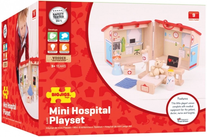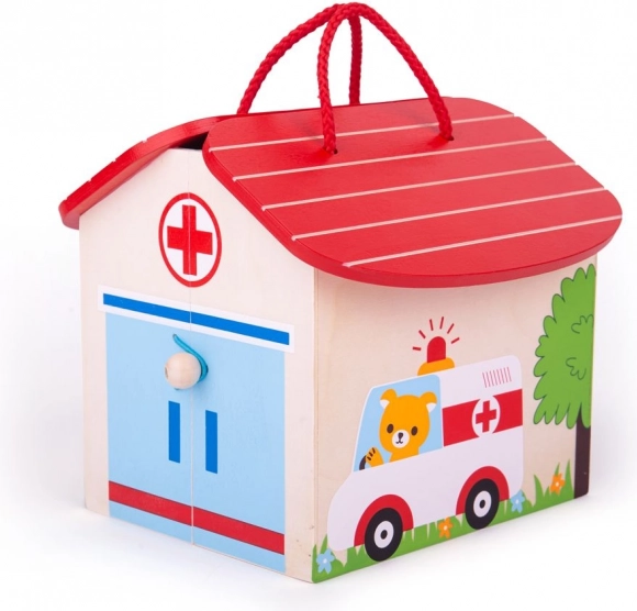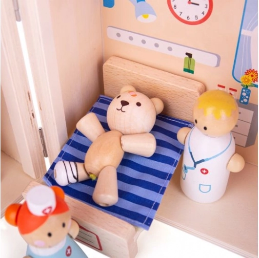 Този компактен и преносим комплект за игра „Мечешка болница“ е идеален за малки лекари. Дървената конструкция е издръжлива и произведена от висококачествени материали, които отговарят на всички европейски стандарти за безопасност. Играчката съдържа девет елемента, които позволяват на децата да създават различни сценарии и ситуации.