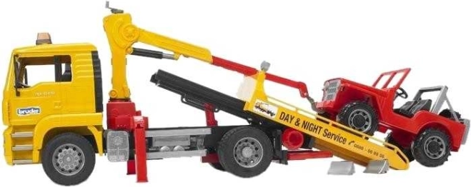 Bruder репатрак MAN е идеалната играчка за деца, които обичат симулациите и играта с реалистични автомобилни модели. Камионът предлага накланяща се кабина, която позволява поглед към двигателния отсек, и е оборудван с предно стъкло от устойчив поликарбонат. Зад кабината се намира въртяща се манипулационна стрела с вериги за лесно боравене с джипа.