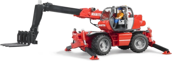 Детайлно изработеният модел на телескопичен товарач MANITOU MRT 2150 от марката Bruder ще зарадва малките строители и колекционери. Предлага въртяща се кабина на 360°, четириколово управление за малък радиус на завой и сменяеми инструменти (кофа, вилици, палетна кошница). Стабилността е осигурена от четири телескопични опори. Качествена изработка от издръжлива пластмаса, произведено в Германия.