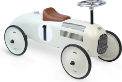 Стилна детска проходилка с вид на състезателен автомобил впечатлява с ретро чар и качествена метална изработка. Предлага тихо движение благодарение на гумираните колела, лесно управление с волан и здрава конструкция с товароносимост 20 kg – идеална за малки състезатели от 1,5 години.