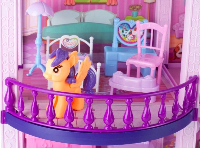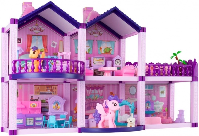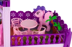 Очарователната Вила е детайлна къщичка в розово-лилави цветове с няколко стаи, балкон и тераса. Благодарение на фигурките на понита и кученце и богатия комплект мебели децата ще създадат свой свят и безкрайни истории. Къщичката е чудесна за съвместна игра на братя и сестри и приятели и развива фината моторика, креативността и комуникацията.