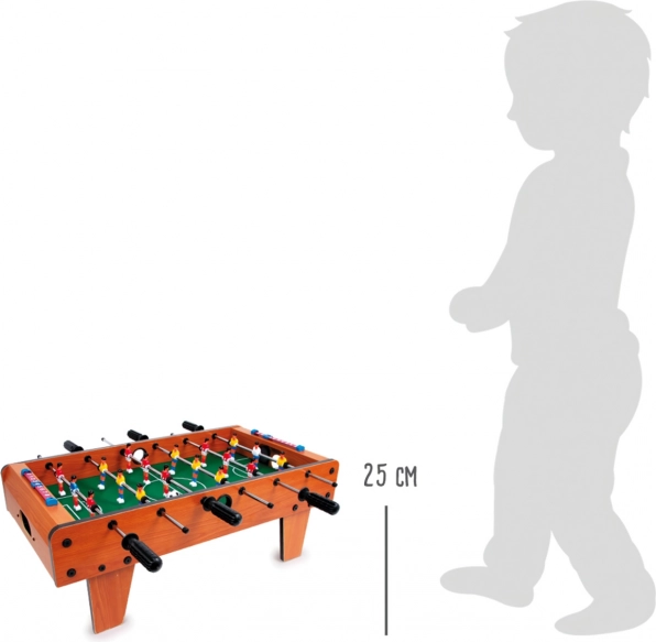 Големият настолен футбол small foot е идеална семейна игра, която лесно се поставя на всяка маса. Благодарение на компактните размери и здравата изработка от лакирано дърво, метал и устойчивa пластмаса, е готов за ежедневни мачове. Зеленото игрално поле с размери 60 × 34 cm осигурява плавна игра и удобно управление на играчите.