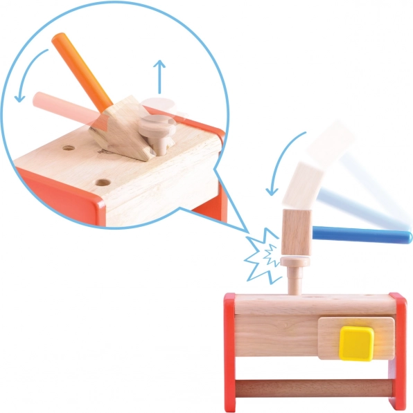 Комплектът е изработен от издръжливо масивно дърво и дървесно-пластмасов композит, което гарантира дълъг живот и безопасност при игра. Атрактивната комбинация от естествен вид и наситени цветове привлича погледа на всяко дете. Децата се учат да сортират инструментите според предназначението им, а благодарение на компактната конструкция се пести място.