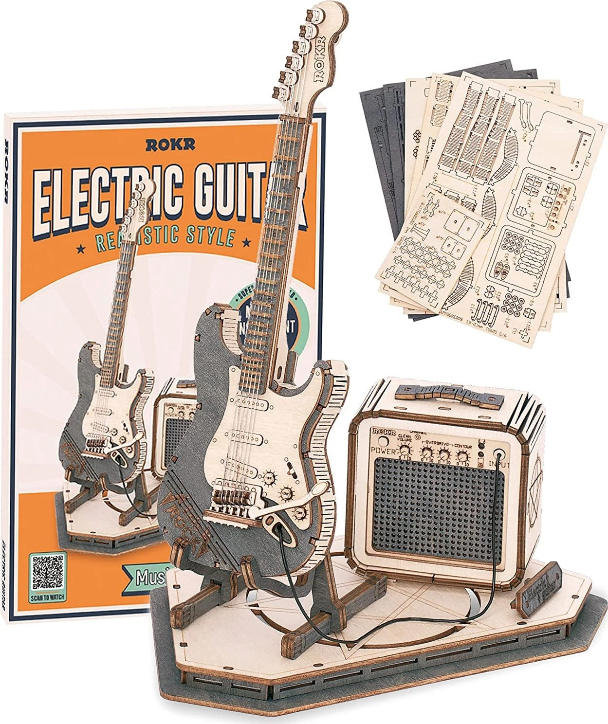 Комплектът съдържа 140 части с ниска трудност, което го прави чудесен избор за начинаещи и по-големи деца. Благодарение на ясните инструкции ще сглобите китарата за приблизително 1,5 часа. Резултатът е реалистичен модел на електрическа китара с усилвател – страхотен подарък за музикални ентусиасти.