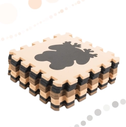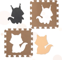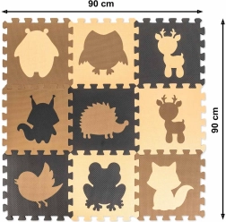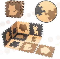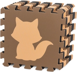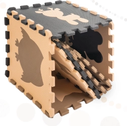 Мека и безопасна подложка за деца от издръжлива EVA пяна в неутрални бежови и кафяви нюанси. Комплект от 9 части с подвижни животински форми образува площ 85 × 85 см и позволява сглобяване и на 3D форми. Изолира от студ, омекотява ударите, водоустойчива е и се почиства лесно. Идеална за първите крачки, игра и учене на форми.