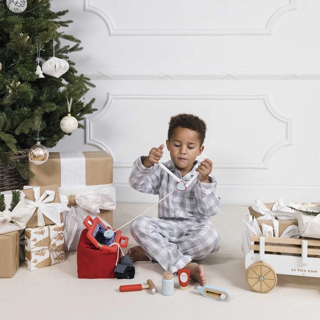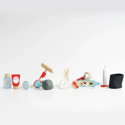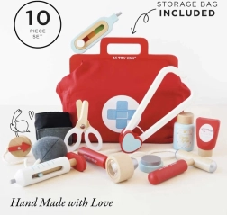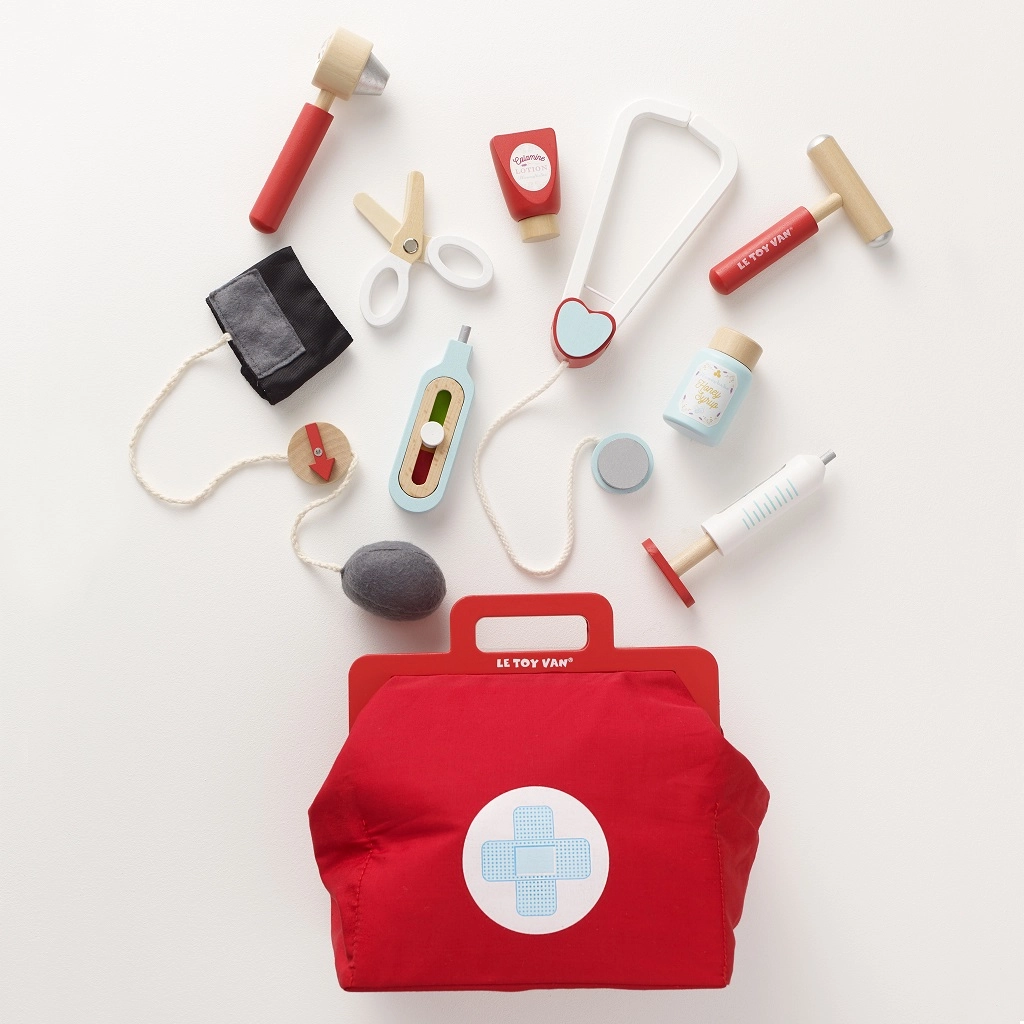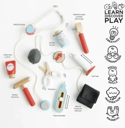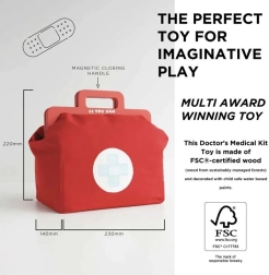 Стилен докторски комплект за малки лекари в текстилна чанта с дървени дръжки носи всичко необходимо за игра на кабинет. Съдържа общо 10 части, включително стетоскоп, термометър и спринцовка. Играчката е неутрална по отношение на пола, подпомага фината моторика, въображението и когнитивните умения. Изработена е от устойчива дървесина с FSC сертификация и ръчно дооцветена с нетоксични бои на водна основа.