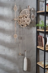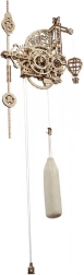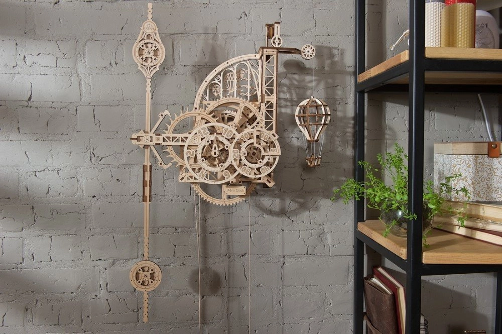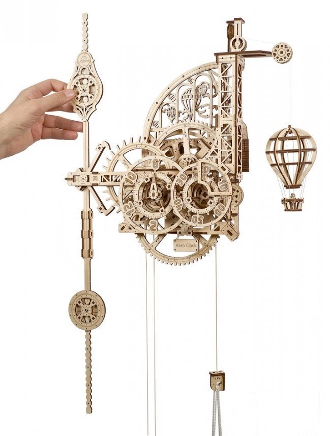 Ugears Aero са стенни механични часовници от висококачествен шперплат, които сглобявате самостоятелно без лепило. Завладяващият поглед към разкрития часовников механизъм с махало и тежест предлага уникално изживяване с прецизното инженерство. Времето се отчита от двойка циферблати, въртящи се обратно на часовниковата стрелка, докато декоративният модел на въздушен балон ритмично се издига и при всяка пълна час спускайки се, дава визуален сигнал.