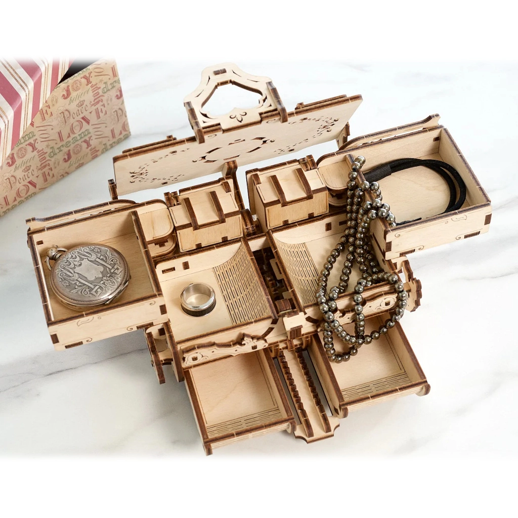 Тази оригинална кутия за бижута в античен стил съчетава прецизно лазерно изрязване с интелигентна механика. След сглобяване получавате функционална кутия с предавки и подвижни части, която впечатлява от пръв поглед и надеждно съхранява вашите ценности. Изживяването при строежа е забавно и поучително – без лепило, само с прецизно пасващи части от качествен шперплат.