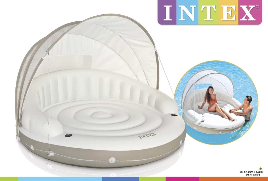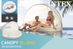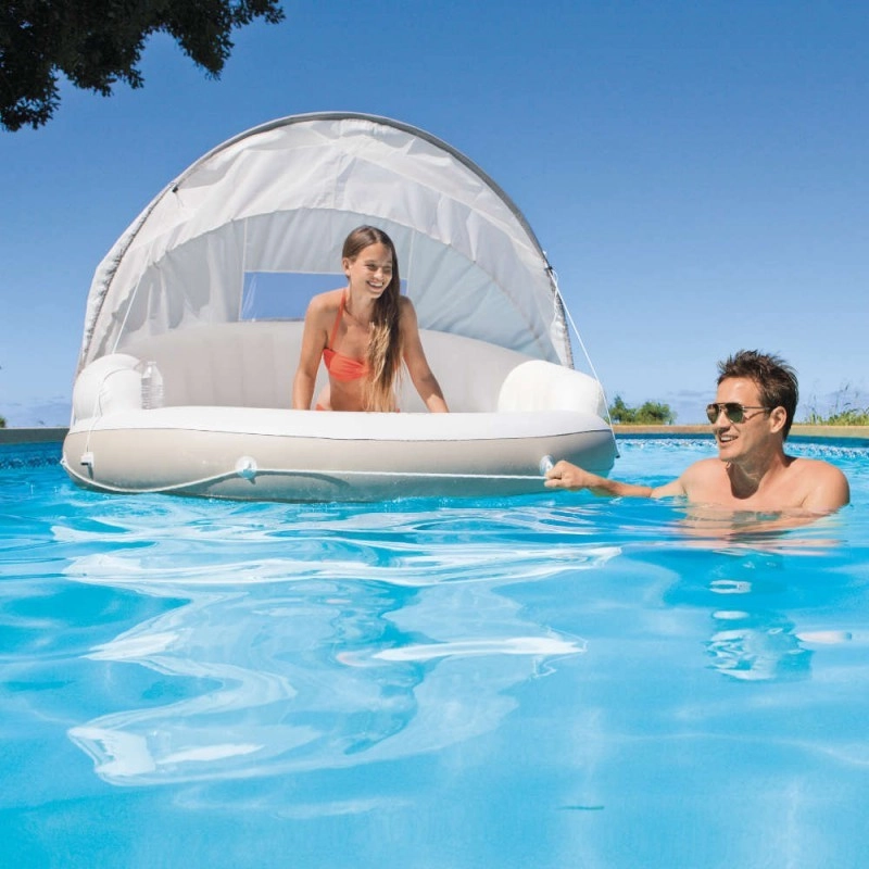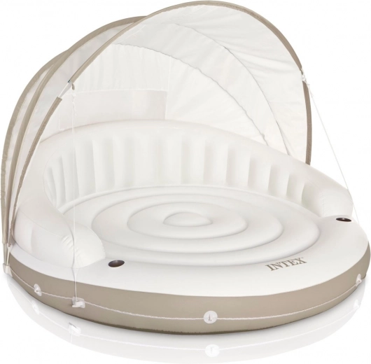Надуваемият остров INTEX осигурява перфектно място за релакс край водата. Подвижният и регулируем сенник дава приятна сянка, когато слънцето пече, а за слънчеви бани се сваля за секунди. Широката площ и оформените облегалки за гръб носят комфорт за дълги часове почивка.