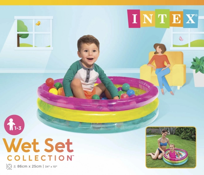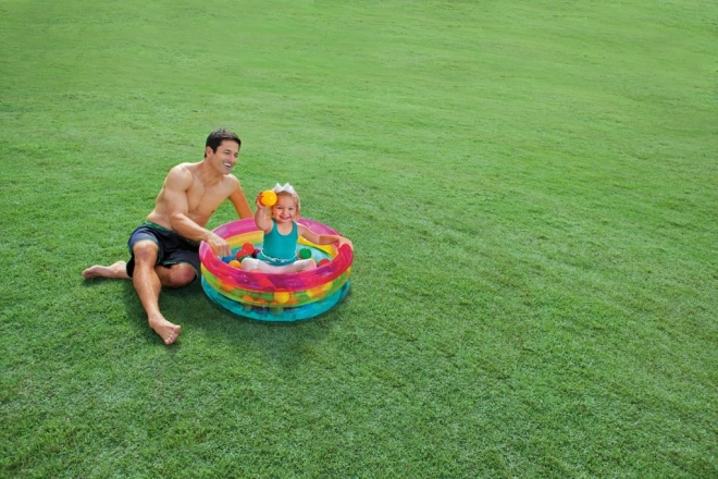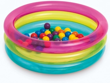 Весел надуваем басейн с топчета от INTEX превръща всяка детска стая и градина в безопасна площадка за игра. Прозрачни стени с розова, жълта и синя ивица. Издръжливото PVC осигурява лесна поддръжка и дълъг живот, идеален за деца на 1–3 години.