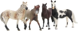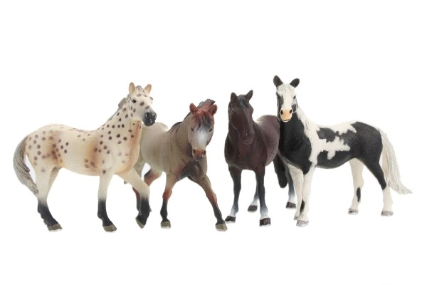 Четири пластмасови фигурки на коне, всяка в различна окраска, което позволява на децата да създават разнообразни сцени и истории.