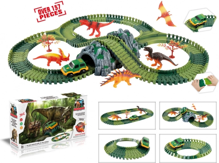 Това вариабилно трасе с динозаври пренася децата в екшън свят от праисторията директно в стаята. Благодарение на гъвкавите елементи релсите лесно се пренареждат и се създават нови маршрути с тунел, завои и мостове. В комплекта има светеща количка, която преминава по сглобената писта и оживява всяко каране.