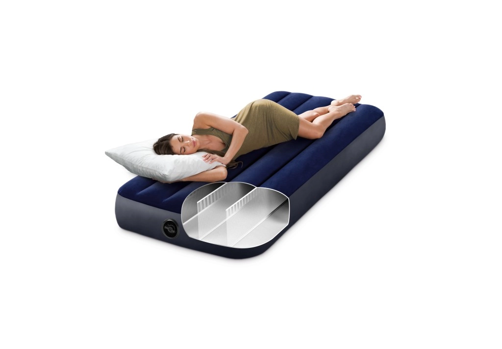 INTEX Надуваем матрак предлага удобен сън благодарение на високоустойчив и водоустойчив материал с технологии Fiber-Tech и Dura-Beam, идеален за дома и пътуване.
