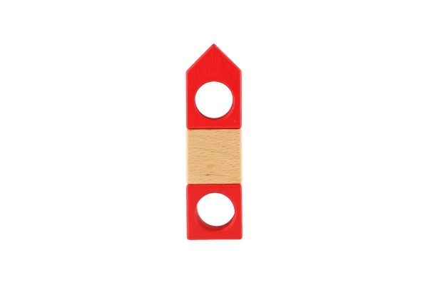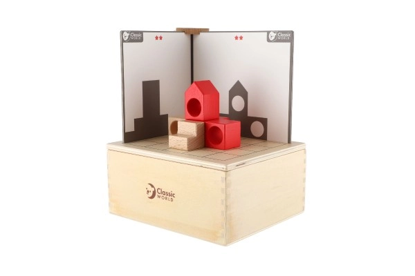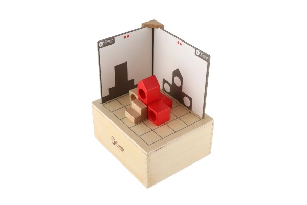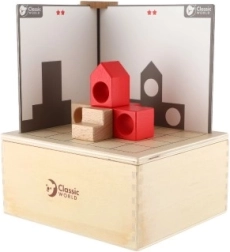 Комплектът е създаден за деца от 3 години, а всички елементи са безопасно съхранени в дървена кутия с размери 18,5 x 16 x 9 см. Децата могат да се опитват да подреждат блоковете по картите и да съчетават двете страни, с което тренират логика и сръчност.