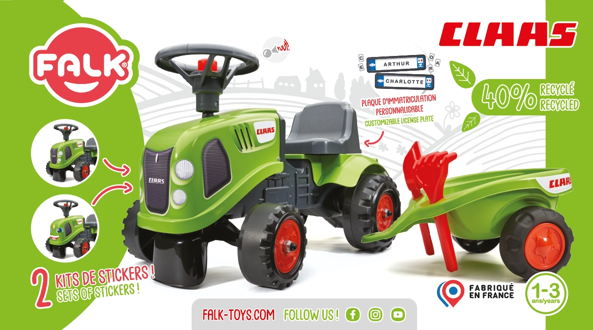 Подвижното ремарке е удобно за превоз на играчки или кубчета, а включените аксесоари (гребло, лопатка, стикери) насърчават креативната и ролевата игра. Количката спомага за развитието на грубата моторика, равновесието и координацията и учи децата на самостоятелност.