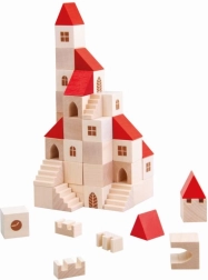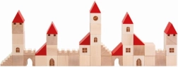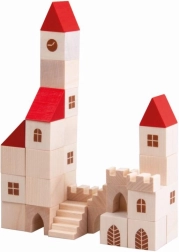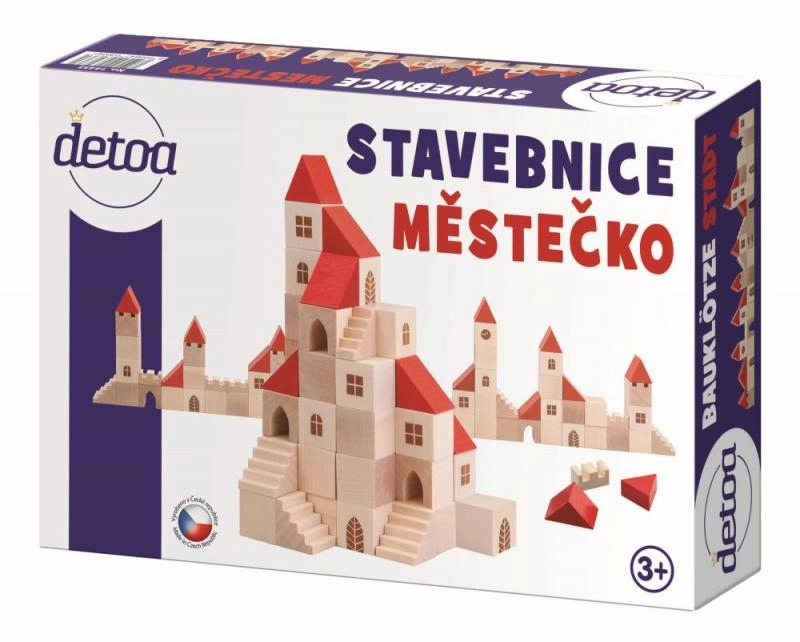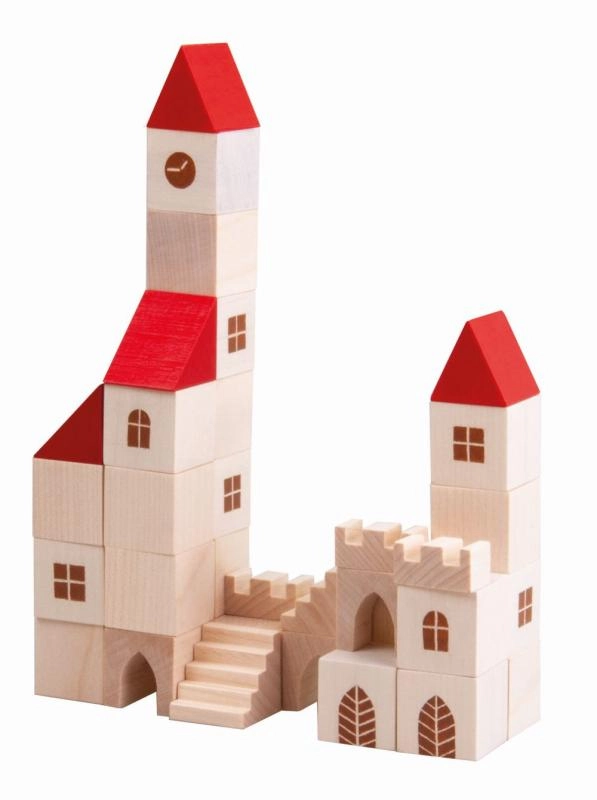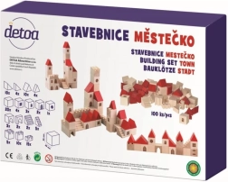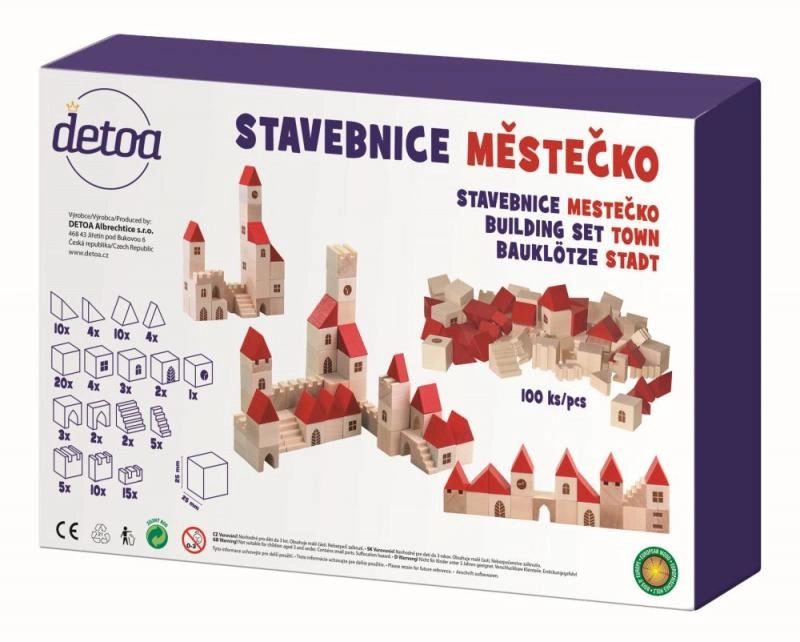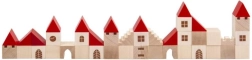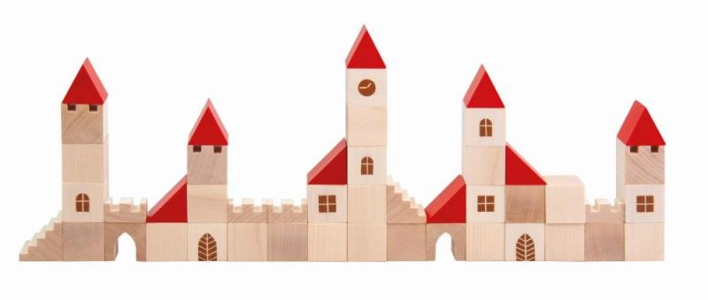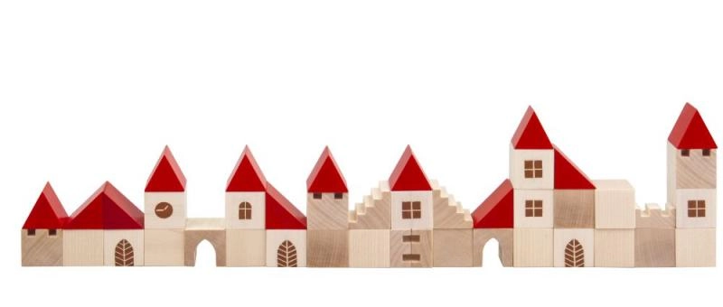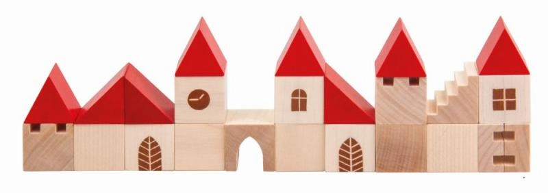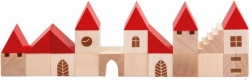 Този дървен конструктор съдържа 100 елемента в различни форми и размери, които позволяват на децата да създадат свое собствено малко градче. Благодарение на цветния дизайн с червени покриви и естествено дърво този конструктор е не само красив, но и напълно функционален за въображаема игра. Помага за развитие на фината моторика и пространственото възприятие у децата.