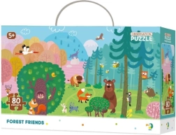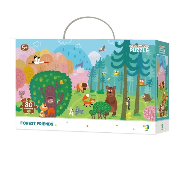 Този красив комплект пъзел с мотив „приятели от гората“ носи на децата не само забавление, но и учене. След сглобяване на картината могат да играят интерактивната игра Намери и открий, по време на която търсят и определят местоположението на различни горски животни. Благодарение на пъстрите цветове и ясните форми децата естествено се учат да разпознават детайли и взаимовръзки.