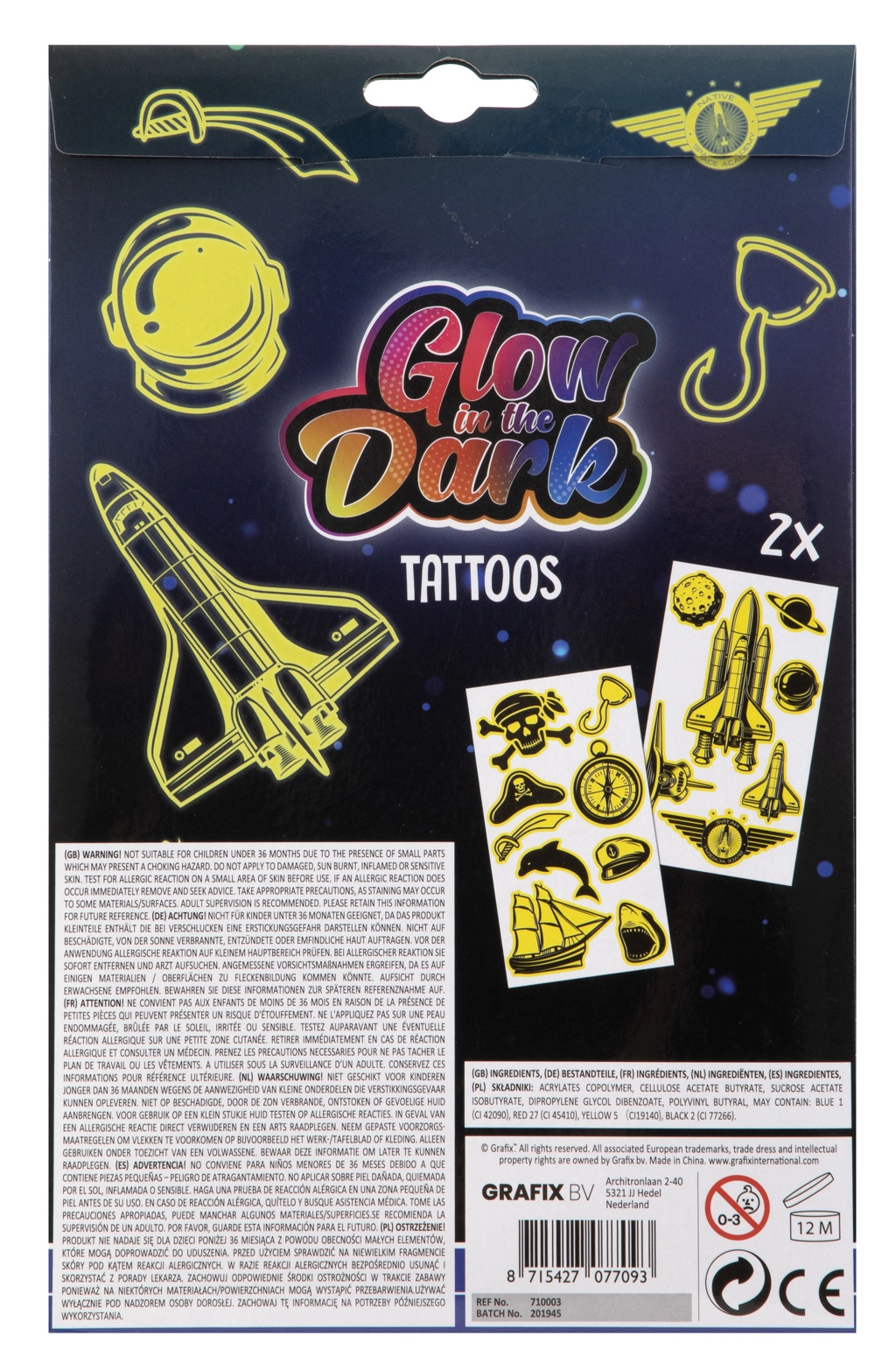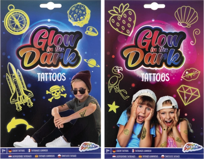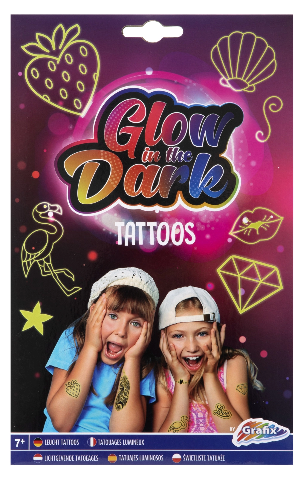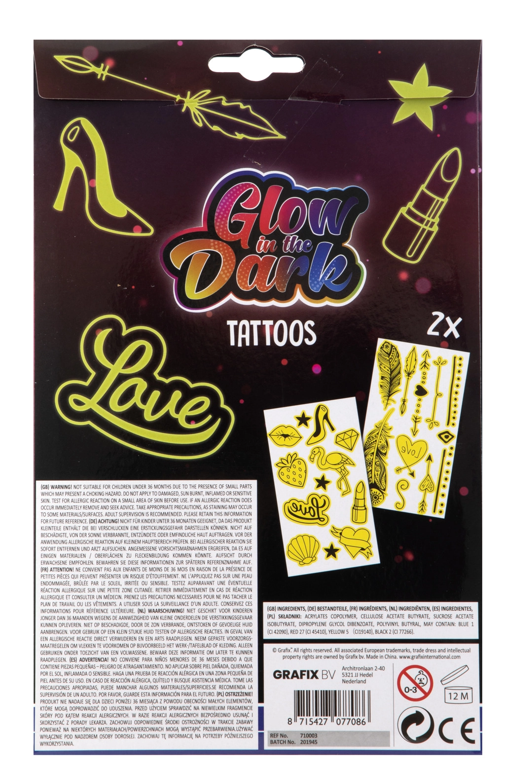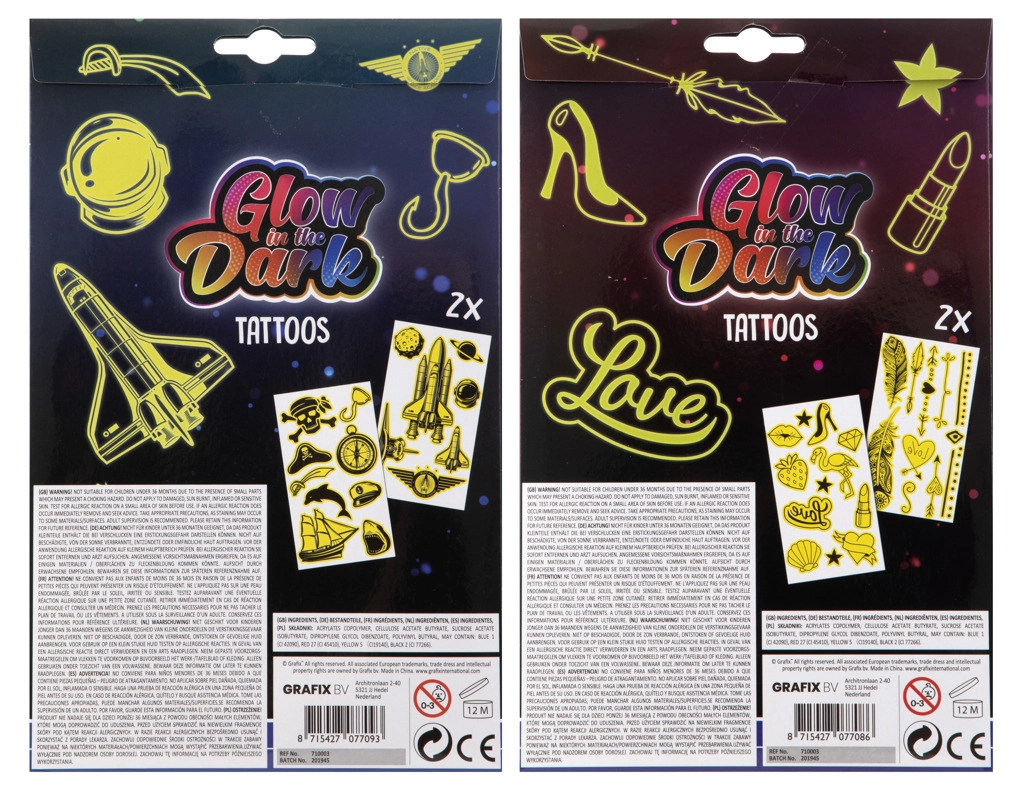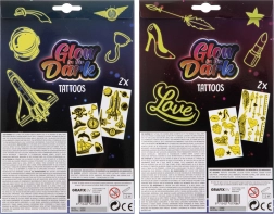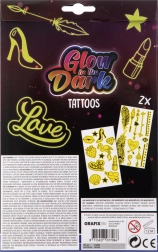 Този комплект светещи татуировки е идеален за момичета, които искат да добавят искра към своя стил. Насладете се на различни мотиви, налични в опаковката, която включва два листа с татуировки. Просто изрежете, поставете върху кожата, навлажнете с гъбичка и готово! Употребата е бърза и забавна.