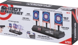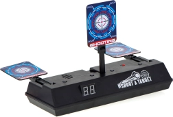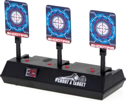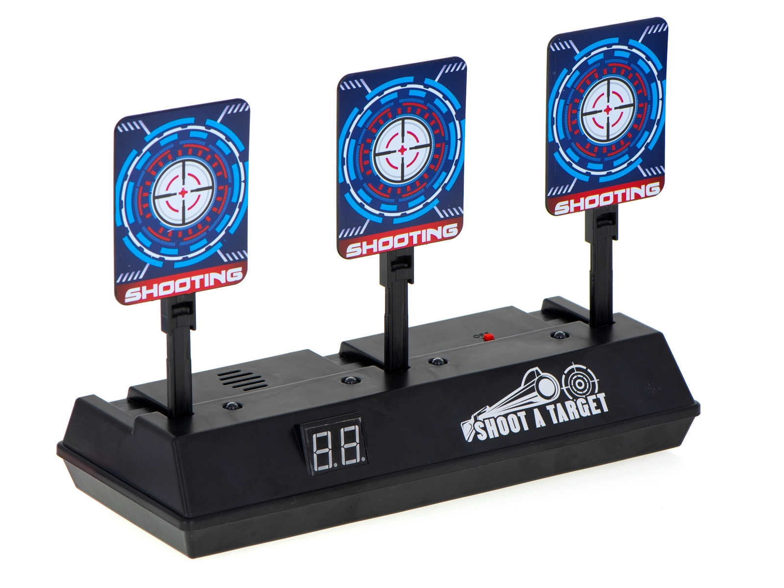 Мишената може да се използва с пистолети с пяна стрели и осигурява истинско изживяване благодарение на звуковите и светлинните ефекти. При попадение ще чуете звук на счупено стъкло или аплодисменти. Мишената е оборудвана с цифров брояч, който записва резултата. Той се нулира автоматично след уцелване на трите цели.