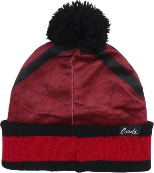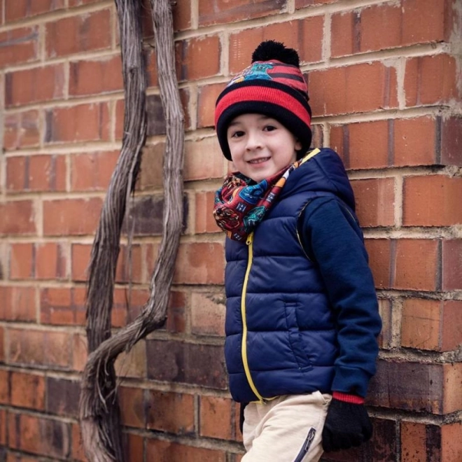 Плетена шапка в червено‑черен дизайн с отличителния герб на Hogwarts и мек помпон държи главата и ушите топли и придава на облеклото магьоснически стил.