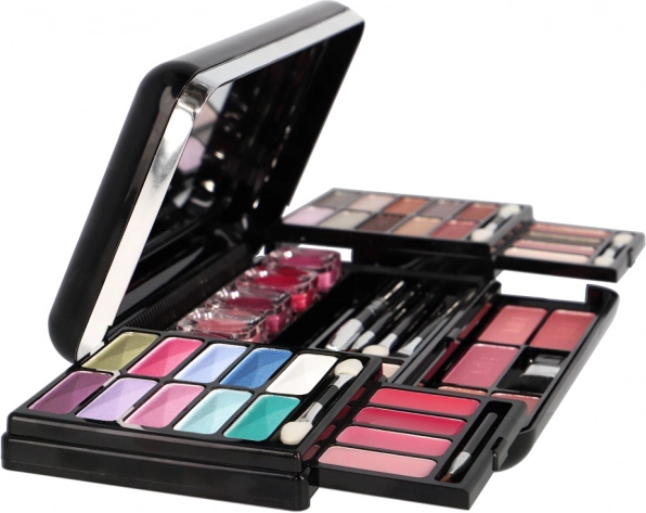 Елегантна черна кутия с огледалце, която крие пълен комплект за грим на очи, лице и устни – идеален за пътуване и ежедневна употреба.